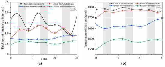The thickness of liquid mold powder film was also one of the factors affecting mold powder consumption, the thickness of liquid mold powder film during three cycles was shown in Figure 8a, the variation of thickness of liquid mold powder film was similar to that of mold powder consumption. With the distance below the meniscus increased from 5 mm to 100 mm, the thickness and variation of thickness decreased, the thickness of liquid mold powder film was within 0.95 to 2.45 0.82 to 1.38, 0.70 to 0.93 and 0.48 to 0.65 mm, respectively. The thickness of the liquid mold powder film was determined by the surface temperature of shell, the temperature of shell surface was presented in Figure 8b. The variation of the temperature of the shell surface was consistent with the thickness of the liquid mold powder film, and the thickness of the liquid mold powder was thickened with the increase of the surface temperature of the shell.