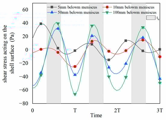 The velocity difference between the shell and the mold was described in Figure 9, which was within −0.0189 to 0.0434 m/s, the velocity difference was determined by the oscillation velocity of mold and casting speed. The shear stress (liquid friction) acting on the shell surface was presented in Figure 10, where the shear stress was positive in the upward direction, and the shear force was within −66.0115 to 55.1505 Pa. The maximum upward τ l appeared at the middle of tn and gradually increased with the distance below the meniscus increased from 5 mm to 100 mm, which was affected by the mold powder consumption in Figure 4. The variation of mold powder consumption was opposite to the shear stress. Therefore, sufficient mold powder consumption could increase the downward τ l and be conductive to the demold.