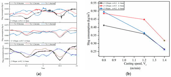 Figure 11. Effect of casting speed on mold powder consumption. (a) Transient mold powder consumption; (b) Average mold powder consumption.