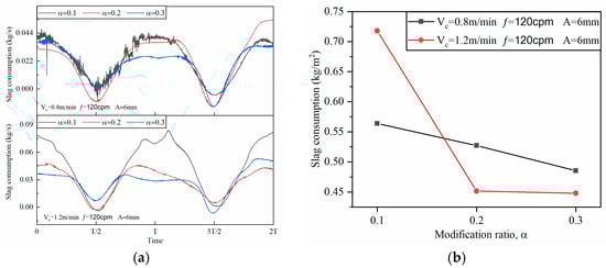 Figure 12. Effect of modification ratio on mold powder consumption. (a) Transient mold powder consumption (b) Average mold powder consumption.