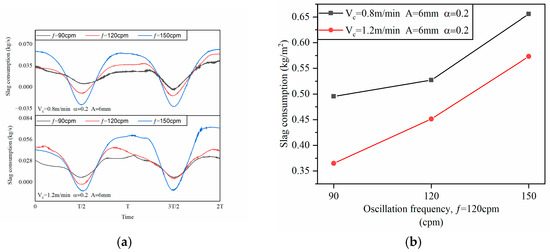 Figure 13. Effect of oscillation frequency on mold powder consumption. (a) Transient mold powder consumption; (b) Average mold powder consumption.