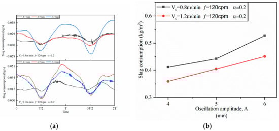 Figure 14. Effect of oscillation amplitude on mold powder consumption. (a) Transient mold powder consumption; (b) Average mold powder consumption.
