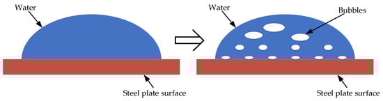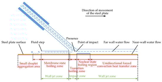 When the cooling water at 24 °C impinges on the surface of a high-temperature steel plate at 810 °C, the convective heat transfer coefficient of the impinging region of the plate surface varies with the temperature. This is related to the state of water on the high-temperature steel plate and the cooling mechanism. Under normal circumstances, the cooling water is in the form of drops in contact with the high-temperature steel plate, and its state changes from water vaporization to water vapor; energy conversion is completed in an instant, as shown in Figure 3. Cooling water with a certain jet velocity and pressure impact on the surface of the high-temperature steel plate contributes to enhanced convection heat transfer. Due to the increase in the flow rate per unit of time, the surface of the steel plate will be formed by a certain thickness of water covered by the impact area of the jet. In the impact area, water and high-temperature steel plate contact will immediately vaporize into water vapor, which forms a bubble with the water’s upward movement. The movement process leads to a reduction in the contact area and tightness between the water film and the steel surface, and the layer closest to the surface of the steel plate is a mixture of liquid water and gaseous water. The formation of bubbles on the surface of the steel plate will lead to the deterioration of heat transfer. Different temperatures of the steel surface affect the water vaporization rate and bubble rise rate, directly affecting the surface of the quenching of the critical interface state, which in turn affects the instantaneous heat transfer efficiency. The actual process jet structure and heat transfer region distribution are shown in Figure 4. The region of transient boiling is on the outside of the fully wetted region. An important difference from nuclear boiling heat transfer is that changes in the surface flow field significantly affect transient boiling. The turbulence intensity of the surface flow field increases the perturbation of the nuclear boiling bubbles, causing them to split into multiple smaller bubbles and increasing their detachment frequency, which in turn enhances the heat transfer intensity. The main heat transfer mechanism in the single-phase convection phase is natural convection heat transfer, where bubbles dissolve quickly even if they are generated. In the membrane boiling stage, the surface of the steel plate produces bubbles in large quantities in the wall connected to form a gas film. The surface and the liquid separation, this time the convection heat transfer coefficient decreases. This time, the convection heat transfer coefficient decreases. This stage is unstable, and thus industry should avoid the heat transfer process of membrane boiling. In this paper, the use of a high-pressure jet impingement steel plate has broken the air film.