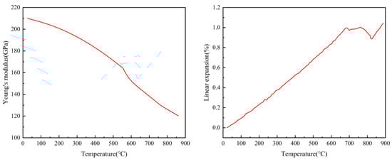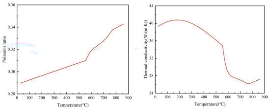 The study was carried out for the currently developed wide and thin-gauge wear-resistant steels with chemical compositions as shown in Table 1. JMatPro v11 is software for phase diagram calculation and material property simulation of metallic materials. With this software, the chemical composition of NM400 can be imported into the software for simulation calculations. The curves of thermal conductivity, coefficient of thermal expansion, modulus of elasticity, Poisson’s ratio, and temperature of this material are calculated as shown in Figure 5.