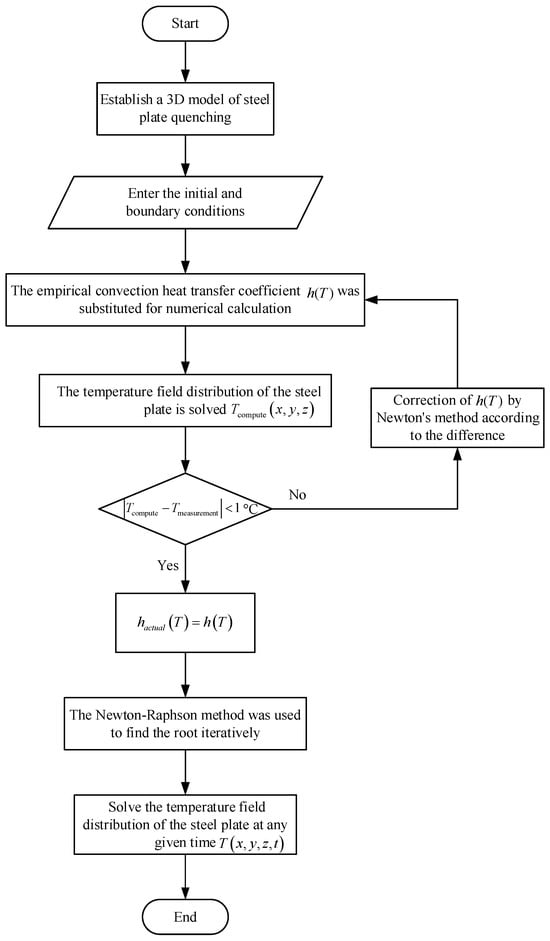 Numerical simulation of the quenching process was carried out using Deform v11, a finite element software with a large advantage in heat treatment. Based on the key thermophysical parameters of the steel plate obtained above, they were programmed and written into Deform v11 software to model the thermophysical properties of the material. The convective heat transfer coefficients were optimally corrected using the inverse heat transfer method based on the measured and calculated temperatures. The modified convective heat transfer coefficients are used as boundary conditions for numerical calculations to iteratively solve the steel plate temperature field. The specific calculation process is shown in Figure 6.
