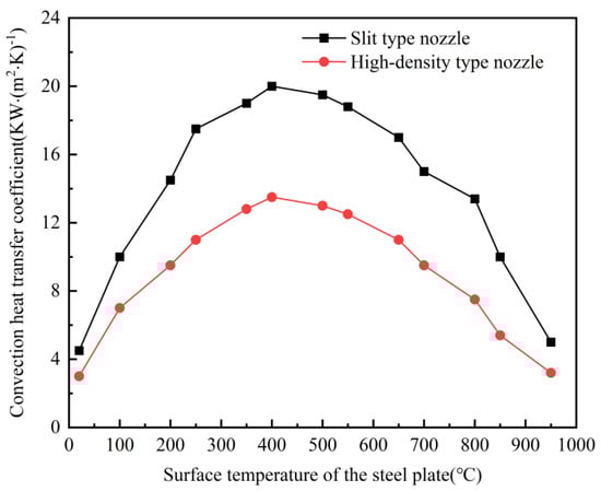 The steel plate roller quenching process is investigated for high-pressure jet impact on a high-temperature moving steel plate for a strong heat transfer cooling process. In different regions of the surface, cooling water impinging on a stationary high-temperature surface undergoes four stages: film boiling, transient boiling, nuclear boiling, and single-phase convective heat transfer [35,36,37]. The convective heat transfer coefficient of cooling water impinging on its surface is different in different temperature zones. In the high temperature range above 650 °C, a certain pressure of the jet contacts the surface of the steel plate, and when the vaporization process is extremely fast, its surface is always attached to the newly generated high-temperature gases. Water vaporization of high-temperature gases after the temperature and the temperature of the surface of the steel plate are positively correlated. Therefore, the actual temperature gradient affecting the convective heat transfer coefficient between the two media is the temperature difference between the surface of the steel plate and the high-temperature gas produced after the vaporization of cooling water. In the temperature range below 300 °C, the vaporization rate of liquid water in continuous contact with the steel plate is substantially lower than in the high temperature range. At this point, the actual temperature gradient can be approximated as the temperature difference between the surface of the steel plate and the cooling water. The temperature range of 300~650 °C is the transition zone. At this time, the surface of the steel plate is in a mixed transition state of high-temperature gas and cooling water, and the temperature gradient is the largest. Therefore, the convection heat transfer coefficient in this temperature range is the largest. Each stage corresponds to a different convective heat transfer coefficient, which in turn affects the rate of temperature drop on the steel plate surface. The performance of thin-specification steel plates after quenching is required to achieve high strength and high wear resistance to ensure long-term stable use in engineering. The key to its performance is the rapid transformation of the steel plate organization from austenite to martensite in the quenched section of the high-pressure zone. In the controlled cooling process, to determine the target organization while at the same time speeding up the entire quenching speed, the efficiency of the entire production line will be improved. The relationship between convective heat transfer coefficient and quenching capacity is shown in Figure 2.