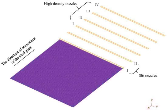 Based on a large number of experiments in the field of a steel enterprise, 1+3 and 2+4 arrangement forms have been tested. Finally, the 2+4 arrangement proved to be more suitable for the quenching of medium and thick plates with variable specifications. That is, the plate passes through the quenching zone, consisting of two sets of slit nozzles and four sets of high-density nozzles in turn. It can be divided into six quench zones for the study: slit I and II regions and high-density I, II, III, and IV regions.