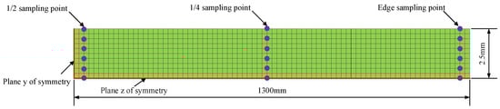 When the transverse temperature of the steel plate is controlled to be uniform, the distribution of equivalent stresses is studied in three states: before, when, and after the steel plate passes through the quenching region of the six nozzles. Temperature and equivalent stresses were extracted at 1/2, 1/4, and the edge of the plate width for 50mm of the plate tail. The cross section of the steel plate and the location of the extraction points are shown in Figure 9.