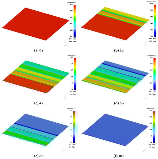 The 0 s moment is the initial moment of entering the quenching machine; the 2 s moment is when the head of the steel plate passes through two sets of slit nozzle zones; the 6 s moment is when the steel plate has passed through the high-density nozzle zone; and the 10 s moment corresponds to the steel plate leaving the roller quenching machine.