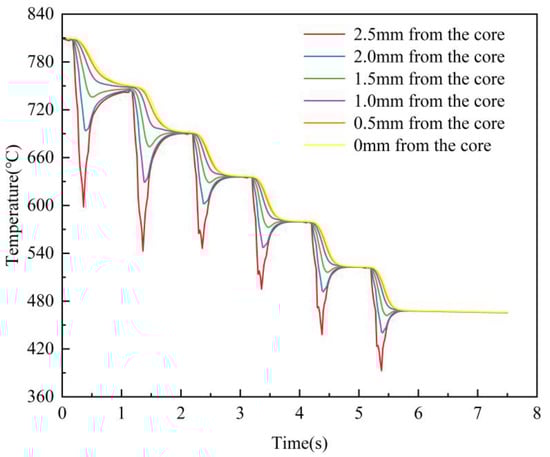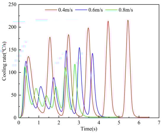 There is a significant retempering of the steel plate in the direction of the upper surface to the thickness of the core during the quenching and cooling process, as shown in Figure 11. When the steel plate passes through the first set of nozzles, the upper surface of the steel plate is rapidly cooled at a constantly changing high cooling rate, and after leaving the first set of nozzles, it is in the gap between the first and second sets of nozzles when the boundary conditions are laminar cooling. Due to the existence of a temperature gradient in the thickness direction of the steel plate, when the surface temperature of the steel plate plummets, the core is still in a transient thermal insulation condition, and then the steel plate will take the heart as a heat source to the surface of the heat conduction. When the heat transferred per unit time is greater than the heat dissipated by surface laminar cooling, the surface of the steel plate warms up briefly instead. When passing through the second set of nozzles, the temperature reached by heating is used as the base temperature to continue cooling, and the cooling is repeated in such a cycle under each set of nozzles. When passing through the slit nozzle, the average cooling rate of the steel plate surface is 588.5 °C/s, and the average cooling rate of the core is 64.8 °C/s. When passing through the high-density nozzle, the average cooling rate of the steel plate surface is 399.7 °C/s, and the average cooling rate of the core is 58.2 °C/s. The steel plate temperature is cooled to 468 °C and leaves the high-pressure quenching and cooling zone. From the above analysis, it is known that the surface temperature of the steel plate will change in the form of jagged fluctuations as it passes through each group of nozzles. As we get farther away from the surface, the temperature fluctuation gets smaller and smaller until there is no obvious fluctuation in the core. Due to the higher convective heat transfer coefficient of the slit nozzle than the high-density nozzle, the temperature fluctuation of the steel plate through the first two slit nozzles is greater than that of the last four high-density nozzles. Steel plate hardenability can be judged by the core cooling rate, so the core cooling rate was calculated separately for different roller conveyor speeds, as shown in Figure 12. The core cold velocity profile resembles the form of a wave function. It can be seen that the larger the roll speed, the smaller the overall crest of the core cold speed curve, the wave spacing of neighboring crests decreases, i.e., the wave speed increases, and at the same time, the amplitude variance of each nozzle section increases.