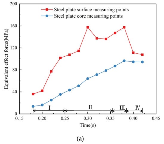 The fluctuation of the temperature field of the steel plate during the quenching process affects the change in the stress field of the steel plate. When the steel plate measuring point passes through the nozzle injection area, the stress difference fluctuates as the temperature difference between the surface and core of the steel plate becomes larger, resulting in an equivalent stress difference of 10.3~93.2 MPa. Before the measurement point enters the slit nozzle, due to a certain temperature gradient in the direction of the thickness of the cooled steel plate, heat transfer occurs between the thicker measurement point and the thicker measurement point that is to enter the nozzle area. This heat transfer process leads to the formation of a temperature difference in the thickness direction of the measurement point, which gradually increases, and the equivalent force difference also gradually increases. During the entry of the measurement point into the injection region of the slit nozzle, the equivalent force difference gradually remains stable as the temperature difference increases. During the departure of the measuring point from the nozzle area, the equivalent force difference increases and then decreases. It can be seen that at the instant of leaving the nozzle, the equivalent force on the surface of the steel plate increases suddenly, while the core maintains the original growth rate, thus leading to a large difference in the equivalent force between the surface and the core. It was found that the maximum stress in the extracted nodes on the steel plate surface occurs at a moment of 0.02 s after each pass through the quenching zone. At this time, the measured steel plate node has been driven away from the nozzle by 8~16 mm. This shows that the maximum equivalent force generated when the steel plate is quenched has a hysteresis. In the nozzle area of the steel plate surface measurement point, the equivalent force is always increasing, but it will not decrease immediately after leaving the quenching area; it will continue to increase, and then the equivalent force will gradually reduce. The maximum equivalent force at the extraction point at 1/2 the thickness of the steel plate occurs at the moment of 0.15 s after each pass through the quenching zone, when the observed steel plate node has sailed away from the nozzle by 60–120 mm. It can be seen that there is a greater delay in the core than in the moment when the equivalent force appears on the surface.