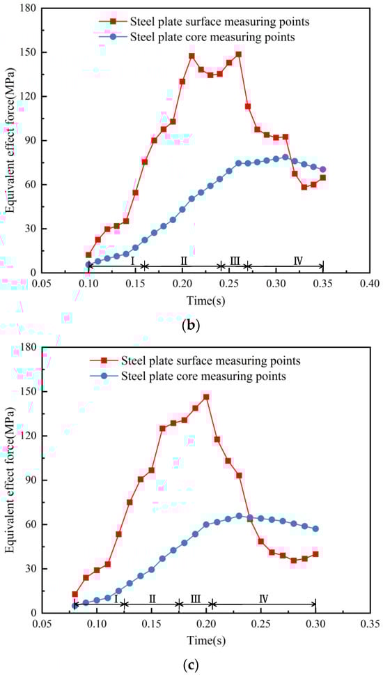 Dynamics of equivalent stresses in the plate thickness toward the measuring point through the quenching region. I—Before entering the nozzle area; II—Located in the nozzle area; III—Initial departure from the nozzle area; IV—Keep away from the nozzle area. (a) Roller conveyor speed of 0.4 m/s. (b) Roller conveyor speed of 0.6 m/s. (c) Roller conveyor speed of 0.8 m/s.