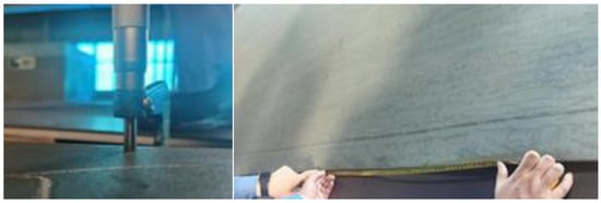 To verify the correctness of the above research results, they were applied to on-site production. As shown in Figure 14, the wave pitch of the side waves of the steel plate before the improvement was measured to be 520 mm, and the wave height was about 5 mm. Through the optimization of the quenching process parameters and field tests, we have obtained wide and thin specification steel plate products with good plate shape, in which the unevenness of 5 mm wear-resistant steel products is ≤5 mm/m. The location of the maximum wave distance of the steel plate measured and obtained before the improvement is at the longitudinal head of the operation side, and after the improvement, the overall plate shape is obviously straight, and the measured straightness meets the standard requirements, as shown in Figure 15.