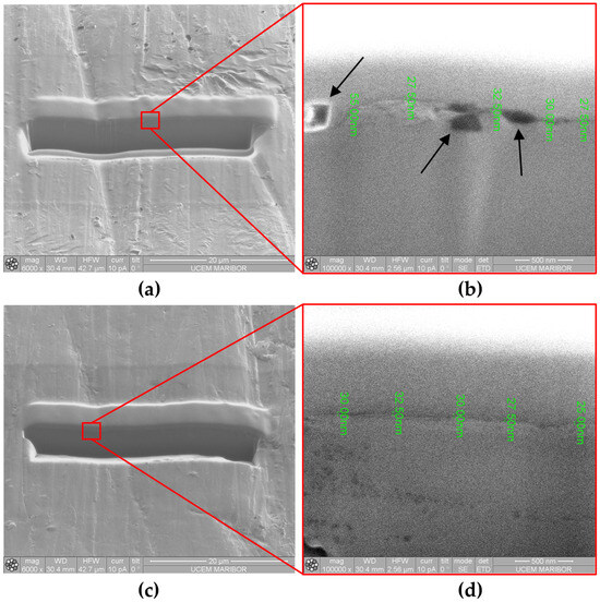 FIB cross-section after immersion testing: (a) NiTi as cast, 6000× magnification; (b) NiTi as cast, 100,000× magnification. Black arrows indicate defects in the oxide layer; (c) NiTicc, 6000× magnification; (d) NiTicc, 100,000× magnification.