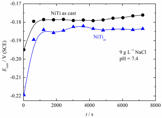 Figure 3 shows the dependence of the corrosion potentials over time for NiTi as cast and NiTicc samples in solution containing 9 g L−1 NaCl and with pH = 7.4. NiTi as cast (thermo-mechanical treatment) reached an almost constant negative value Ecorr of −0.18 V, and NiTicc, without treatment, reached −0.19 V for the same time duration.