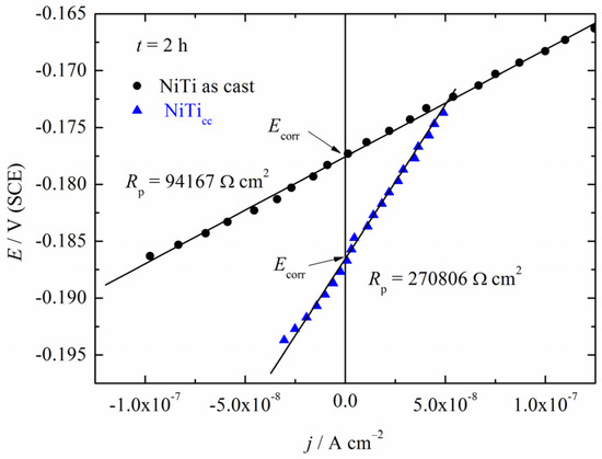 Linear polarization measurements for NiTi as cast and NiTicc after 2 h of exposure to the corrosive medium, 9 g L−1 NaCl.