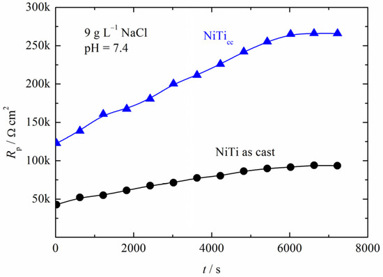 The diagram given in Figure 4 represents linear polarization measurements (LPRs) after stabilization of the corrosion potentials of the investigated samples for 2 h. Based on the obtained values, it was demonstrated that NiTicc has a three-times-higher corrosion polarization resistance in comparison with the NiTi as-cast alloy. The increase in the polarization resistance indicates that the corrosion current density decreased. Moreover, if Rp changes over time, that indicates some surface processes, usually oxide film formation [24].