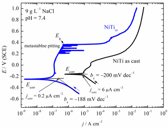 The polarization curves of the investigated samples are shown in Figure 6. NiTi, as cast in the anodic direction, practically showed the very narrow potential region of pseudo-passivity followed by active dissolution without Tafel behavior. The slope of the cathodic line was very high, −200 mV dec−1, indicating a complex oxygen reduction reaction probably coupled with changes in the oxide surfaces. The corrosion current density was roughly estimated to be 6 μA cm−2. NiTicc showed much better corrosion behavior. The cathodic slope was also very high at −188 mV dec−1. A corrosion current density of 0.2 μA cm−2 was roughly estimated from the intercept of the cathodic line with the corrosion potential of −0.25 V. Initiation of the passive state started from ~−0.2 V with a passive current density in the range of 0.1 μA cm−2, followed by a metastable pitting region from 0.2 V to 0.37 V, and at ~0.37 V breakdown potential, Ep, or pitting propagation was observed. Considering that differences in the estimated corrosion current densities differ from the determined polarization resistance, we used the modified Stern–Geary equation for the case when the anodic slope tended to infinity: