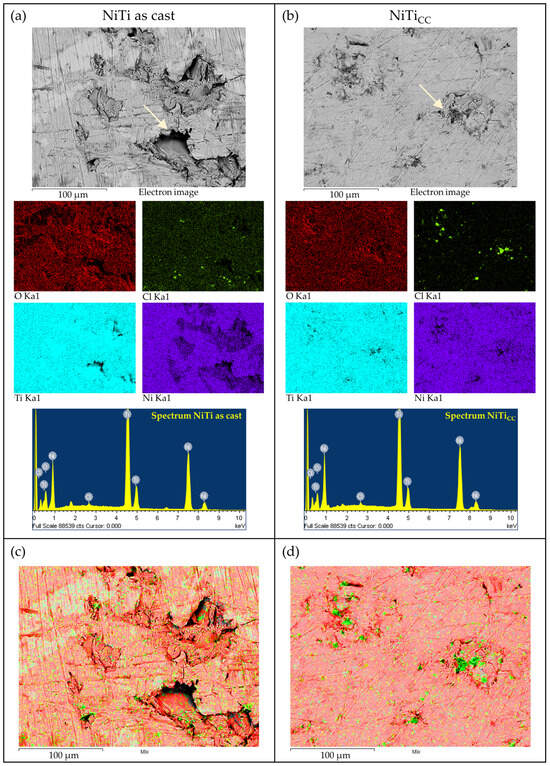 SEM micrographs and EDX mapping of samples after polarization testing: (a) NiTi as cast, (b) NiTicc. White arrows indicate initiation of pitting corrosion. (c) NiTi as cast EDX mapping image of O and Cl content, (d) NiTicc EDX mapping image of O and Cl content. Oxygen is shown in red color, chloride is shown in green color.