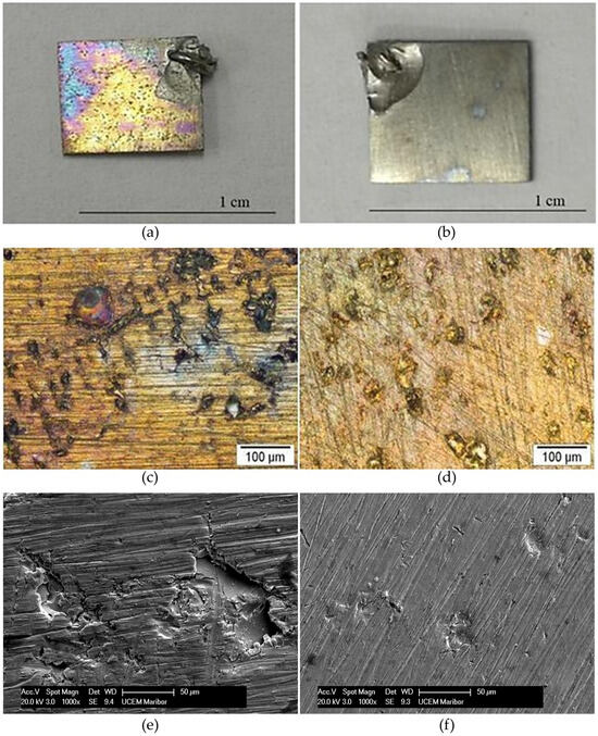 Visual inspection of samples after polarization testing: (a) macro view of NiTi as cast; (b) macro view of NiTicc; (c) optical microscopy of NiTi as cast (200× magnification); (d) optical microscopy of NiTicc (200× magnification); (e) electron microscopy of NiTi as cast surface (1000× magnification); (f) electron microscopy of NiTicc (1000× magnification).