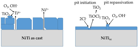 Simplified schematic presentation of the corrosion processes under anodic polarization of NiTi as cast and NiTicc.