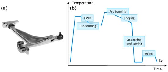 Figure 1. (a) Image of the fully assembled front lower control arm produced in this study. (b) Thermomechanical process for the production of the front lower control arm at Raufoss Technology.