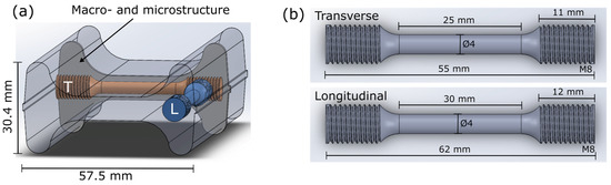 Tensile test specimens (according to ISO 6892-1 [25]) were extracted from the forged components in two different positions and directions as shown in Figure 3a, the longitudinal (L) and transverse (T) directions. The longitudinal direction was parallel to the initial extrusion and cast direction of the forging specimens. The dimensions of the tensile specimens are shown in Figure 3b. In total, three parallels in each direction were tested. The average results are presented, including the deviation among the obtained three values, indicated by ±.