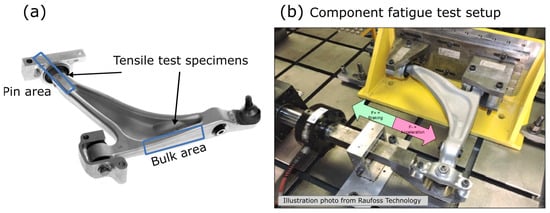 Figure 4. (a) Position of the tensile test specimens of the forged front lower control arm. (b) Setup for the in-house fatigue trials of fully assembled front lower control arms.