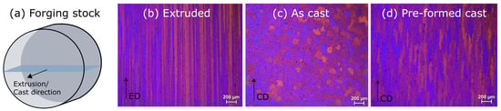 The initial microstructure of the extruded, as-cast and pre-formed cast forging stocks is shown in Figure 5b–d, obtained from the cross-section illustrated in Figure 5a, i.e., the microstructure is viewed parallel to extrusion (ED) and casting direction (CD). Both the extruded and cast forging stock exhibited the expected microstructure, elongated grains with a clear extrusion texture for the extruded and equiaxed grains for the as cast material, with an average grain size of 81 μm. The pre-formed cast microstructure consisted of elongated and slightly deformed grains resulting from the CWR pre-forming process, in which the material was compressed and elongated simultaneously.
