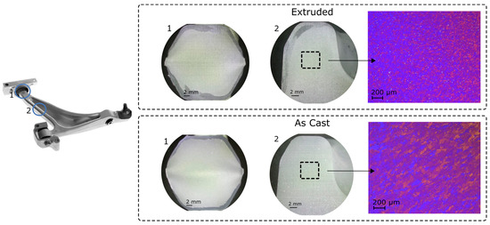 Figure 7. Macro and microstructure in selected positions in the forged front lower control arms. (Top): extruded forging stock. (Bottom): cast forging stock. The front lower control arm and the investigated positions are highlighted on the suspension component on the left.