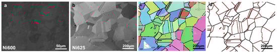 The microstructure of (a) SEM figure of Ni600; (b) SEM figure of Ni625; (c) EBSD mapping with inverse pole key (IPF)-z coloring of Ni625; (d) CSL among the grain boundaries (∑3 is red) of Ni625.