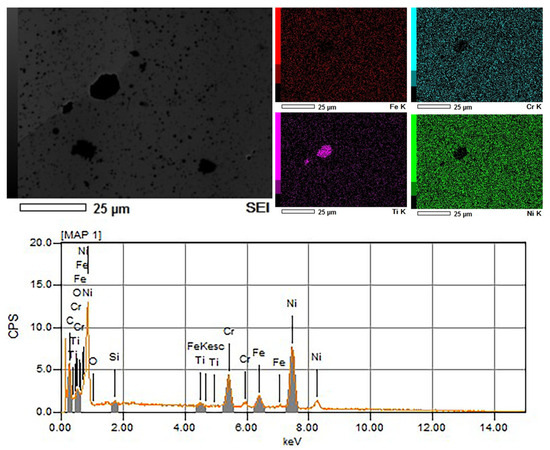 Before etching, the energy-dispersive spectroscopy (EDS) analysis of Ni625 was conducted and the results are depicted in Figure 2. A comparison of the optical figures with the scanning electron microscopy (SEM) figure revealed that the relatively large and black geometric polygon in the SEM figure corresponded to the orange phases in the optical figures. These black phases were predominantly located at GBs, although they were also observed within grains. The polygonal area was deficient in chromium and nickel but exhibited a high percentage of titanium, which was identified as titanium nitride.
