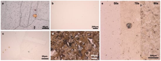 Before etching, it is essential to inspect the polished surface for scratches. However, etching can unintentionally make previously unnoticed scratches stand out. This happens because the etching solution interacts more with the scratches, removing material around them more extensively and making them more prominent. Also, the etchants that have filled in the scratches are more difficult to clean after etching, which makes the etch marks more visible. As the frequency of etching and repolishing increases, the number of scratches diminishes, resulting in an improved surface. The polishing procedure should be flexibly adjusted to accommodate these changes [26]. In this study, an electrolytic etching solution was prepared, and the samples were affixed to the anode. The cathode was coated with a conductive metal, and the insulation was painted to the metals to restrict the diffusion of current and shield a portion of the surface from the etchant. This allowed for a comparison with the etched area in subsequent optical figures and facilitated the comparison of different etching time steps. The cathode was maintained in the solution, and the DC power supply was activated. The positive electrode was then immersed in the etchant for a predetermined duration to accomplish the purpose of electrolytic etching.