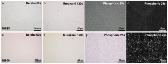 After experimenting with various etchants, Figure 5a shows that the Beraha etchant facilitated the effortless identification of titanium phases, while the application of Murakami etchant slightly highlighted GBs in Figure 5b, though the depth of etching was comparatively superficial and the incidence of black spots within the grains was lower than that observed with other etchants. Despite these limitations, Murakami etchant demonstrated superior efficacy in accentuating titanium compounds, as evidenced in Figure 5b where the sample etched for 120 s is displayed. However, the performance of these two etchants in Ni600 is not obvious, as demonstrated in Figure 5e,f.