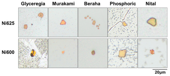 Comparison of the optical figures showing titanium phases after etched using different etchants on Ni625 and Ni600 (subfigures are cropped from large optical figures, and polarized colors are uniformly corrected).