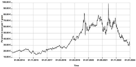 - Palladium Price in EUR per Troy Ounce for Last 10 Years. Available online: https://www.bullionbypost.eu/palladium-price/10year/ounces/EUR/ (accessed on 15 October 2023).