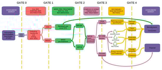 - Gate 0–1: End-of-Life (EoL) consumer goods collection and sorting into EoL Electronic and Electric Equipment (EEE) for reuse and WEEE for recycling (or disposal);