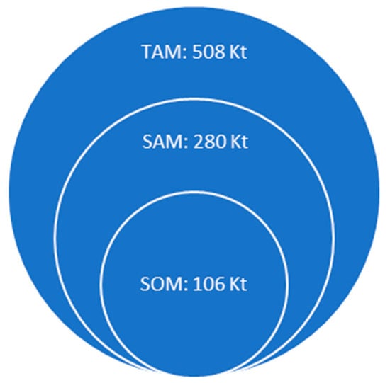 Assuming WPCBs form 4–7% (5.5% average) from total WEEE collected for recycling weight. TAM: World WPCBs e-scrap; SAM: EU WPCBs e-scrap; SOM: Baltic sea region (Nordics, Baltics, Germany, Poland) [26].