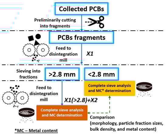 The disintegration milling, sieving, and testing scheme of PCB pre-treatment for metal concentrate obtained using one-step (X1) and double-step (X1(>2.8) + X2) disintegration milling [49]. Reprinted on CC BY 4.0 open access basis.