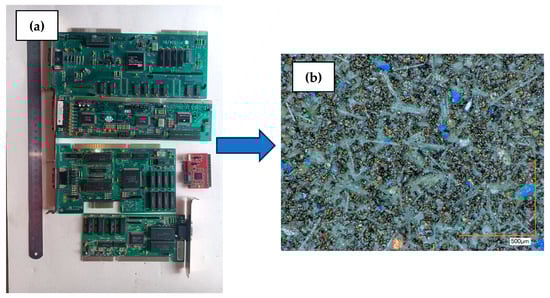 Image of studied PCB “P3” (computer motherboard without processor) (a) and optical image at magnification ×200 of disintegrator-crushed metal concentrate (fraction < 90 µm) (b) [50]. Reprinted on CC BY 4.0 open access basis.
