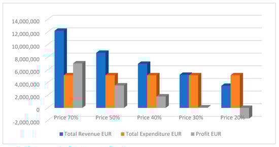 The main assumption was that precious metals as a concentrate are worth 50% of their market value in pure form. Taking into account that the price of the extracted metals can fluctuate, we have provided a graph on possible profit/loss scenarios if the extracted material’s price drops from 50% to 20% of the market price. Increasing the selling price by +20% from the base scenario and reaching 70% of the pure metal price significantly increased the profit (Figure 10) and could shrink the payback period.