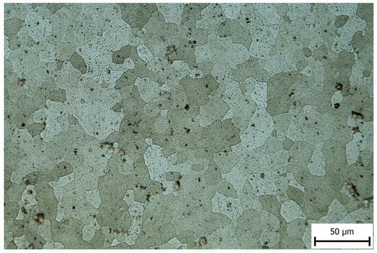 Grain size influences material properties, such as ductility, machinability, and mechanical properties. Decreasing grain size results in an increase in hardness, yield stress, or strength [24]. The etched microstructure of 2024-T3 (Figure 1) is composed of grains with an average size of 17.4 µm and coarse inclusions. Following [1,25,26], the microstructure can, thus, be considered fine-grained.