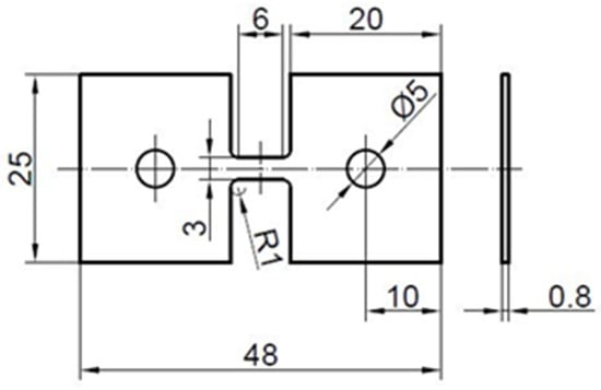 To study material anisotropy, specimens were taken along 0°, 15°, 30°, 45°, 60°, 75°, and 90° relative to the rolling direction. The same specimen geometry with a pin connection presented in Figure 2 was used for all tests, regardless of the strain rate. In this way, the effects of both geometry and boundary conditions on the results was suppressed.