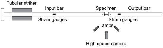 Analysis of SHTB tests relies on the one-dimensional wave propagation theory [18]. The amplitudes of the waves are kept below the elastic limit of the input and output bars, allowing the use of Hooke’s law to calculate the forces and at the interfaces between the specimen and the input bar and output bar, respectively: