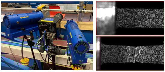 For all tests, the specimen deformation was measured using DIC [19]. The method is non-contact and provides a complex full-field deformation analysis. The measurement process consists of four stages, i.e., specimen surface preparation, calibration of devices, image recording (before and during the experiment), and image processing [20]. The accuracy of the technique is affected by factors that can be grouped as errors related to the specimen, loading, and imaging (size of the speckle pattern, image resolution, illumination intensity, etc.) and errors related to the correlation algorithm (inappropriate subset size, correlation function, shape function, etc.) [21,22]. The speckle pattern (Figure 5) was applied to the gauge section prior to the experiment. The pattern was made by spraying black paint on a white background. To measure in-plane deformations at quasi-static strain rates, a 5Mpxl F-504B Allied Vision Stingray camera (Allied Vision Technologies GmbH, Stadtroda, Germany) was used. The specimen was illuminated by two LED lamps. The experiments at intermediate and high strain rates were captured by a high-speed Photron Mini AX200 camera (Photron, Tokyo, Japan) and illuminated with two Dedocool lamps (see Figure 5).