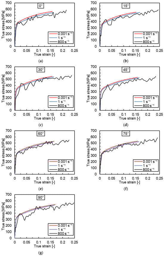 True stress–strain curves for different strain rates and specimen orientations relative to the rolling direction of (a) 0°, (b) 15°, (c) 30°, (d) 45°, (e) 60°, (f) 75°, and (g) 90°.
