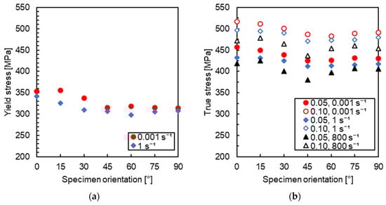 Figure 7a shows the 0.2% value of yield stress versus specimen orientation for quasi-static and intermediate strain rates. Results from SHTB were not included, as oscillations prevented the calculation of reliable values. NSRS was observed for yield stress values at all specimen orientations. The maximum and minimum yield stresses at the strain rate of 0.001 s−1 were 355 MPa (specimen orientation: 15°) and 314 MPa (specimen orientation: 90°), respectively. The values at the strain rate of 1 s−1 ranged from 294 MPa to 342 MPa. Figure 7b depicts flow stresses extracted at a true strain of 0.05 and 0.1 for the different specimen orientations. To exclude the effect of oscillations, values at the highest strain rate were calculated from curves fitted to the Hollomon law (see Equation (8)). The flow stress values confirm the NSRS. The evolution of the flow stresses at different specimen orientations followed the trend seen for the yield stress in Figure 7a.