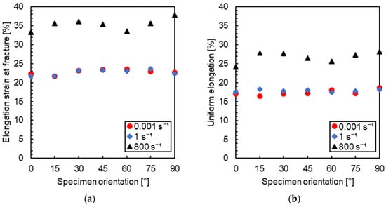For high strain rate experiments, the elongation strain at fracture was significantly higher compared to the values at other strain rates (see Figure 8a), thus confirming the findings in [8]. Moreover, the uniform elongation calculated from the gauge length at maximum force (Figure 8b) exhibited the same trend. Compared to the flow stresses, the effect of specimen orientation was less pronounced at all strain rates considered.