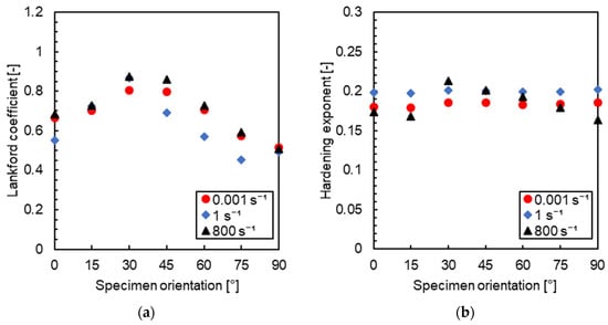 The plastic anisotropy exhibited by the sheet metal resulted in Lankford coefficients being significantly lower than 1 and the variation of the Lankford coefficient with respect to the rolling direction, as can be seen in Figure 9a. The maximum values for all strain rates were located at specimen orientations of 30° and 40°. Coefficients lower than 1 indicate higher strains along the thickness direction compared to the width direction, which is critical for forming applications. A similar evolution of the Lankford coefficient with testing direction is presented in Barlat et al. [11]. The hardening exponent (Figure 9b), on the contrary, showed a negligible dependence on the specimen orientation. The deviations of dynamic strain rates could be due to the oscillations of the stress–strain curves from which the hardening exponent was extracted. As was the case for the Lankford coefficient, the hardening exponent was only moderately influenced by the strain rate.