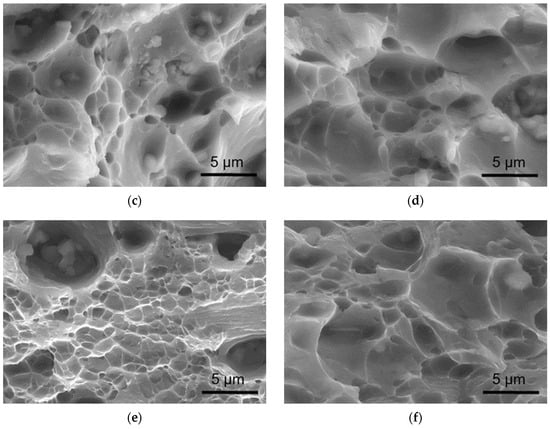Figure 10 shows the fracture surfaces of specimens cut along the 45° (Figure 10a,c,e) and 90° (Figure 10b,d,f) directions relative to the rolling direction. The micrographs were taken at a high magnification (5000×) to comprehensively identify the fine dimple morphology typical of a ductile fracture process resulting from the nucleation, propagation, and coalescence of voids. A combination of very shallow and deeper dimples is a typical type of fracture for aluminium alloys and other metals tested at ambient temperature [30]. The aluminium alloy 2024-T3 was subjected to natural aging, which resulted in the precipitation of homogeneously distributed submicron particles, causing strengthening and acting as initiation points for the creation of very fine dimples on the fracture surfaces (Figure 10c). No clear relationship between fracture morphology and strain rate was observed. Indeed, no noticeable changes were observed in the size or shape of the dimples when the strain rate was increased.